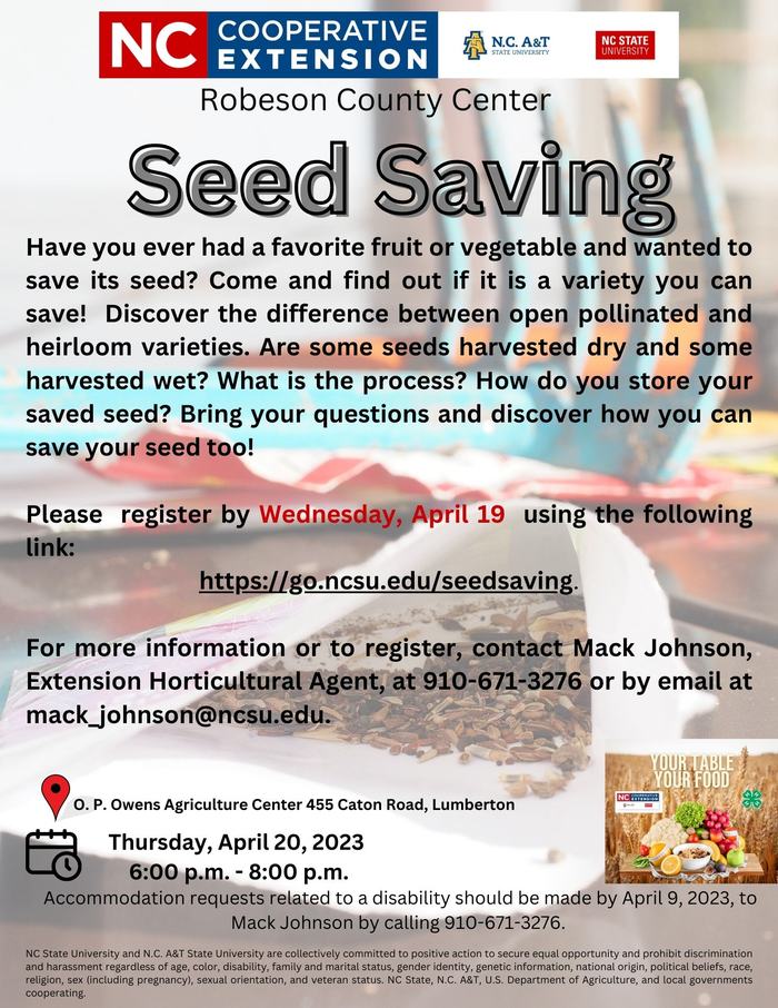 For more information or to register, contact Mack Johnson, Extension Horticultural Agent, at 910-671-3276 or by email at mack_johnson@ncsu.edu.
